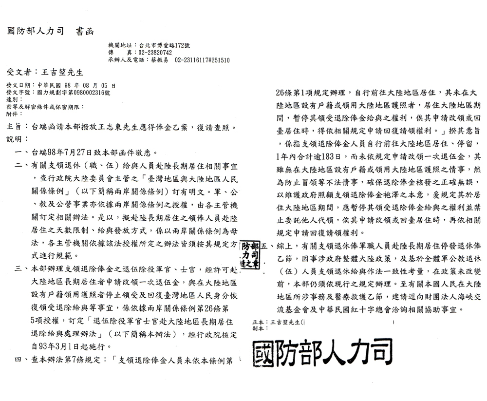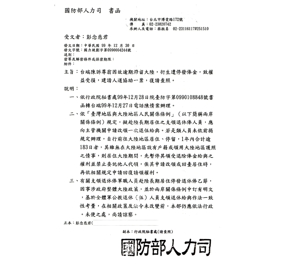 四.99年12月31日退輔會公文證明:副本交由國防部