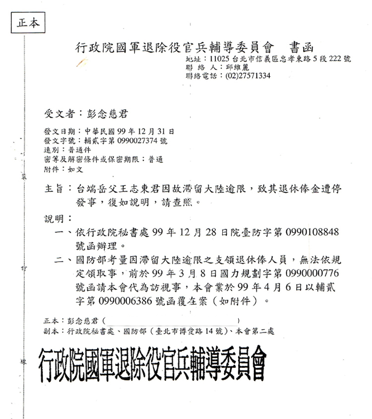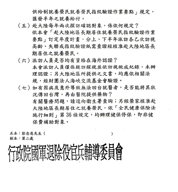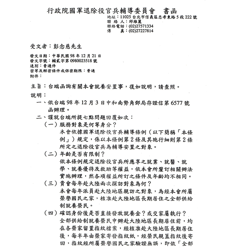 退輔會民國99年12月31日回覆行政院函中的附件指出: