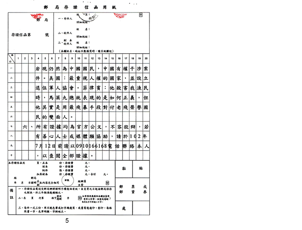 四.102年7月存證信函372號都已警告將公告國際請求公審,卻依然無任何做為,