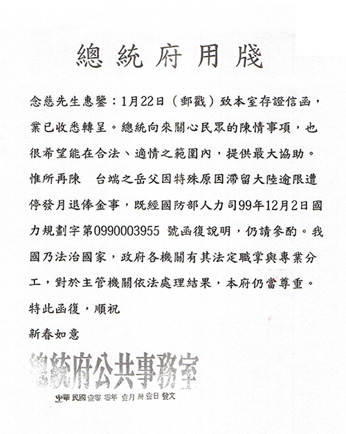 二.退輔會99年12月31日公文正案:依行政院辦理,行政院必定依程序回文總統府,