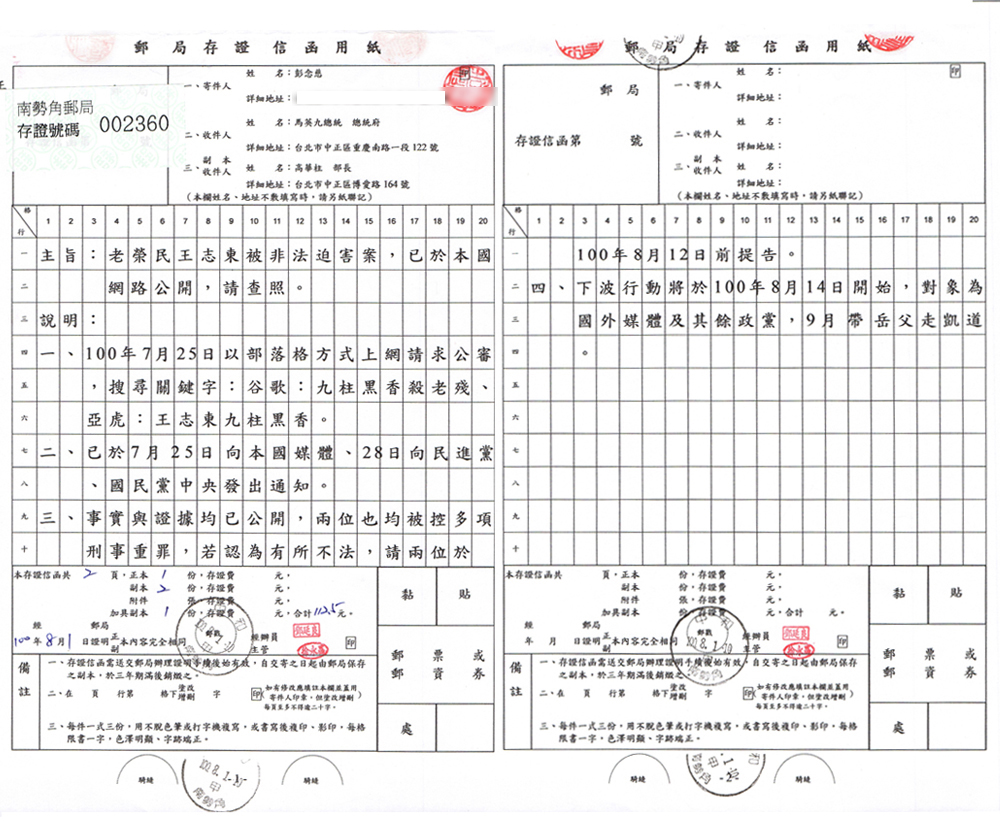 三.102年7月3日存證信函372號證實:總統府報案警察登門抓人,見到證據後,
