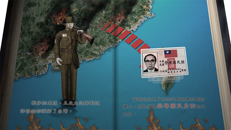 戰爭結束後,王先生隨著戰後倖存的部隊到了臺灣,當時政府為了感念這群英勇抗戰的軍人,特地頒發榮譽國民身份