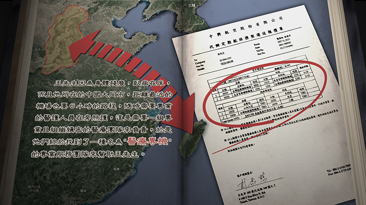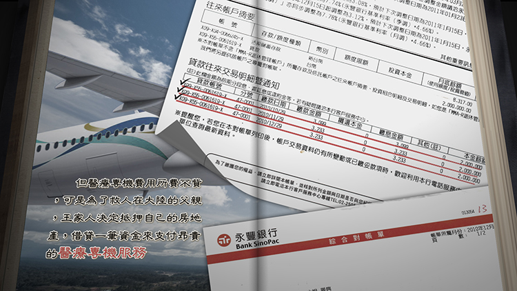 但醫療專機費用所費不貲,可是為了救人在大陸的父親,王家人決定抵押自己的房地產,借貸一筆資金來支付昂貴的醫