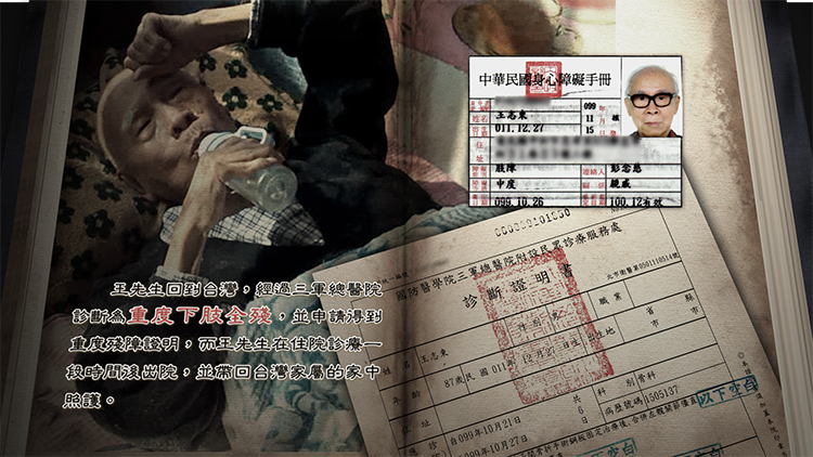 王先生回到臺灣,經過三軍總醫院診斷為重度下肢全殘,並申請得到重度殘障證明,而王先生在住院診療一段時間後